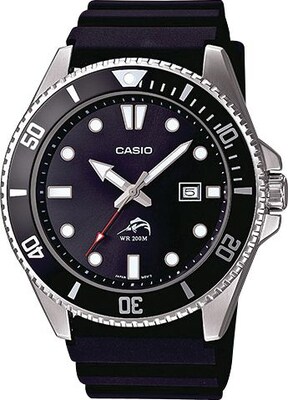 Casio® Men's analog duro dive wrist watch in silver color has a classic look with its black resin band and stainless-steel case. Watch has anti-reverse bezel which adds dive functionality and offers date display for an easy read.