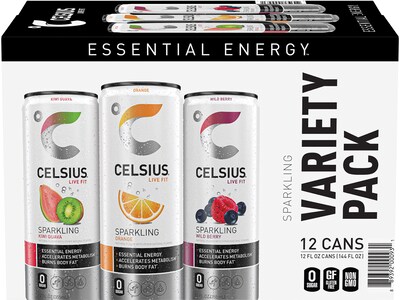 Celsius Sugar-Free Kiwi Guava, Orange, Wild Berry Variety Pack Sparkling Energy Drink, 12 fl. oz., 12 Cans/Carton (00097)
