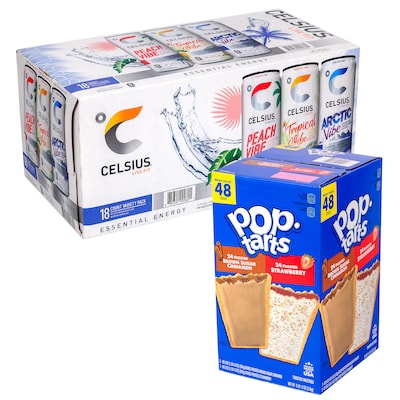 - Includes Celsius Vibe Variety 24 Pack (Peach Vibe, Tropical Vibe, and Arctic Vibe) and Kellogg's Pop-Tarts Variety 24 Pack (Strawberry & Brown Sugar Cinnamon )