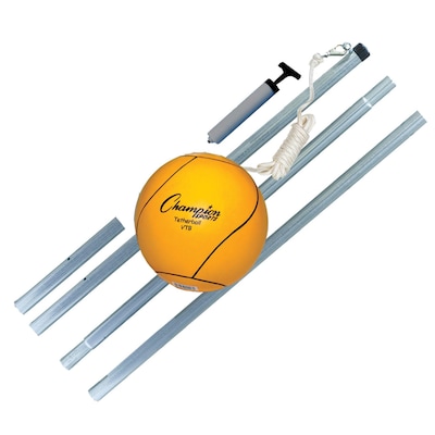 Champion Sports® Deluxe Tether ball set includes three 1 1/2 steel telescopic 24" poles, 6" inflating pump/needles and 12" ground sleeve. Set is ideal for 5 - 18+ year kids.