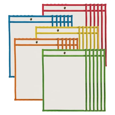 These durable pockets will save paper and money by allowing you to re-use the same sheets over and over. The pockets surface cleans easily with a dry erase cloth or eraser. Pockets feature a side panel opening that allows you to easily insert and remove papers. Reinforced stitching along the piping and a convenient grommet hole allow you to store these pockets on any hook. Holds insert sheets up to 9" x 12". Pack of 30 in assorted colors.