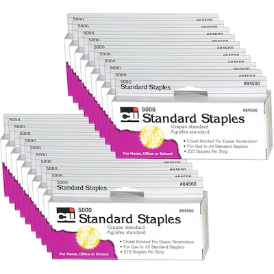 High-quality, precision-made staples fit all standard size staplers. Chisel-pointed for sure entry. 210 Staples per strip. Convenient hand tab box. Each box includes 5000 staples. Sold as 20 boxes for a total of 100,000 staples.