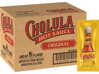 The Cholula Original hot sauce is crafted from a generations-old family recipe that features arbol and piquin peppers, with a signature blend of spices, to deliver Mexican hot sauce heat and flavor. Taste the best life has to offer with the Cholula Original. Your go-to hot sauce for flavorful heat and a perfect partner for everything: from eggs to pizza, chili, and Mexican-inspired dishes like carne asada or fish tacos, burrito bowls, nachos, and margaritas. Single-serve packets are great for breakrooms, on-the-go use, and takeouts.