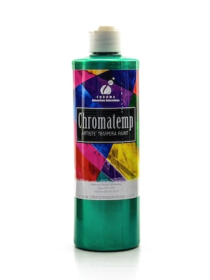 Brilliant, rich luster intermixable colors. ChromaTemp is a quality liquid tempera formulated for posters, windows, and crafts. It functions well using brushes, rollers, fingers, or sponges. Ready to use--designed to be used at full strength. Color does not separate in container. May be over painted without lifting paint underneath. Washes from tools, skin, and most machine washable clothing using warm water and hand soap. Conforms to ASTM D-4236.ChromaTemp Pearlescent Tempera Paint is available in 8 oz. and 16 oz. bottles.