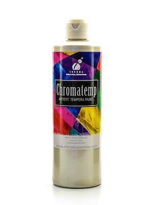 Brilliant, rich luster intermixable colors. ChromaTemp is a quality liquid tempera formulated for posters, windows, and crafts. It functions well using brushes, rollers, fingers, or sponges. Ready to use--designed to be used at full strength. Color does not separate in container. May be over painted without lifting paint underneath. Washes from tools, skin, and most machine washable clothing using warm water and hand soap. Conforms to ASTM D-4236.ChromaTemp Pearlescent Tempera Paint is available in 8 oz. and 16 oz. bottles.