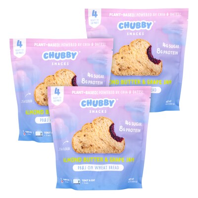 Chubby Snacks Almond Butter & Grape Jam Sandwich, 10.6 oz, 12 Pk Chubby Snacks is bringing the traditional PB&J to the 21st century. Our plant-based Almond Butter and Jam sandwiches are powered by chia seeds and sweetened with dates. Packed with tangy sweetness and salty swirls within soft wheat bread, we provide a low-sugar, high-protein, high-fiber snack for both kids and adults.