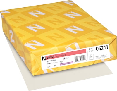 Neenah Paper Classic® Linen writing paper in antique gray color measures 8 1/2" x 11" and is acid/lignin free for long-lasting documents. Paper is ideal for letterheads, proposals or communication, sold as 500 sheets per ream.