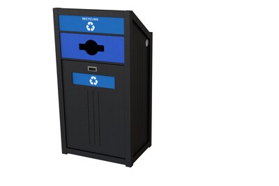 - Comes in black with blue Recycling high-visibility stream graphic; made of HDPE recycled plastic