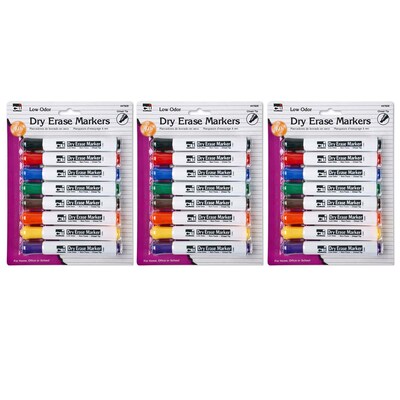 Barrel style dry erase markers feature low odor and bright vivid colors. Use on dry erase boards or glass. Markers wipe away clean and easily. Features a chisel tip and is non-toxic. Each pack includes 8 markers in assorted colors: red, blue, green, black, yellow, brown, orange and purple. AP Certified, conforms to ASTM D-4239. Sold as 3 packs for 24 markers total.
