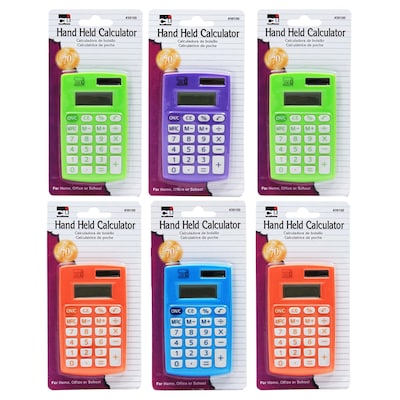 The hand held calculator features an 8-digit display, full memory functions and non-slip rubber keys. These sleek calculators have mercury free batteries and are dual powered. Comes in an assortment of colors. No color choice. Sold as a pack of 6 calculators.