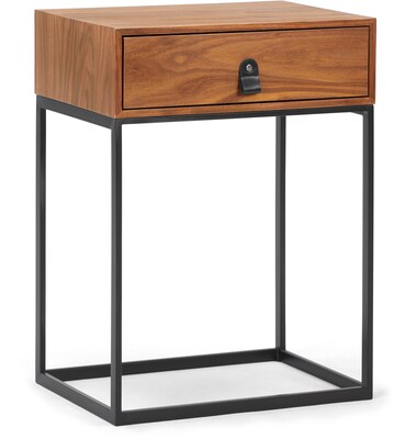 This side table has charming mid century modern styling and easily adds extra storage space in your living room, den or bedroom. This table is constructed with sturdy black metal and features a warm toned wood drawer that can be used to store smaller room items. The black leather drawer pull adds an unexpected yet modern, organic touch. This accent table has a simple, slim profile and the small footprint makes it ideal for placement in small spaces.