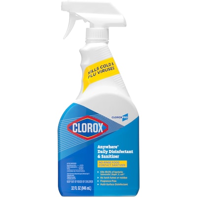 CloroxPro Anywhere Daily Disinfectant and Sanitizer is designed to disinfect hard nonporous and food contact surfaces. Certified by NSF*, CloroxPro Anywhere Daily Disinfectant and Sanitizer kills cold and flu viruses** & 99.9% of bacteria***, including Salmonella, Staph and E. Coli. As a hypochlorous acid based formula, the cleaner is tough on bacteria yet mild enough to use around kids, pets and food, thanks to its low odor and no residue. It allows you to sanitize without rinsing, leaving only the clean smell behind. This Clorox spray comes in a trigger spray bottle and is well suited for commercial spaces like hospitals, public restrooms, daycare centers, hotels, kennels, institutional kitchens, laundry rooms, offices and schools. *Nonfood Compound. Category D2. Reg. No. 162863. CloroxPro, where clean means everything. **Human Coronavirus, Influenza Virus, Rhinovirus, Canine Parvovirus. ***Salmonella enterica, Staphylococcus aureus, Escherichia coli 0157:H7.