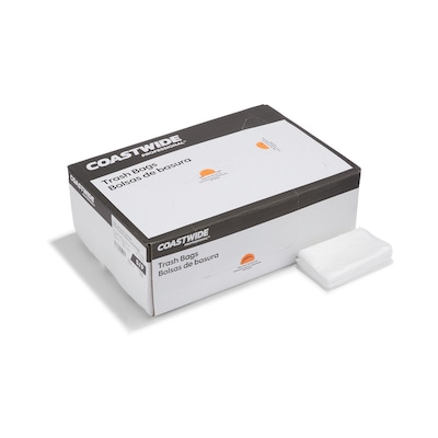 Outfit your bathroom or break room waste bins with these easy-to-lift trash bags to keep a spotless workspace. The clear material gives a view of the contents, helping prevent theft, while the flat pack enables seamless dispensing. These unscented Coastwide Professional™ light-duty 0.35-mil trash bags come in a 1,000-count carton to keep up with the demands of big organizations.