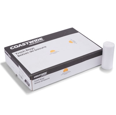 Get rid of office waste with these trash bags. The high-density polyethylene construction offers impressive lifting strength, while the natural clear material lets you inspect contents to prevent accidental loss. These Coastwide Professional™ 12-16 gallon high-density trash bags have star-sealed bottoms that ensure even weight distribution and help prevent leaks when disposing of wet items. This comes with 25 trash bags per roll, with 20 rolls per carton for a total of 500 bags.