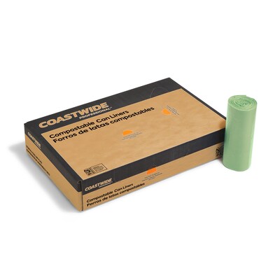 Ideal for office kitchens, these tear-resistant can liners come in a convenient box of 150, divided into 6 easy-dispensing rolls. Select a cleaning staple you can trust with the 30-gallon Coastwide Professional™ Compostable Can Liners. These bags can easily handle heavy organic waste and are leak-resistant thanks to their star-style seal at the bottom that adds extra durability.