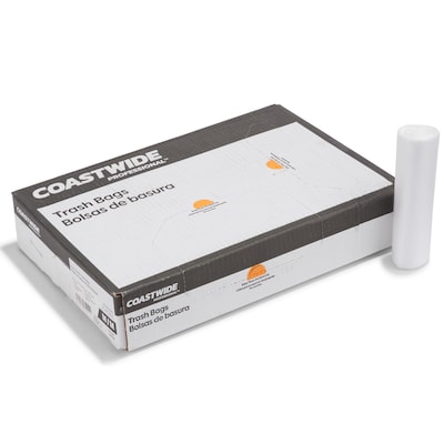 Handle office and maintenance messes with these commercial trash bags. The light-strength high-density material provides excellent lifting strength to ensure safe waste disposal, while the natural construction provides a view of the contents to avoid loss. These 20 to 30-gallon Coastwide Professional™ trash bags come in a carton of 500, providing an ample supply, and are wrapped in coreless rolls for seamless bag changing.