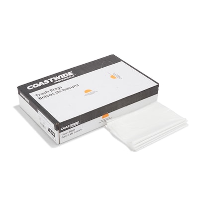 Monitor waste levels quickly with these clear industrial-purpose trash bags. The 1.1-mil strength withstands regular general-purpose use, while the flat pack container easily releases one bag at a time. These Coastwide Professional™ 50 to 56-gallon clear low-density trash bags are unscented for increased comfort, and the star-seal design helps prevent leaks and supports storage of wet garbage.