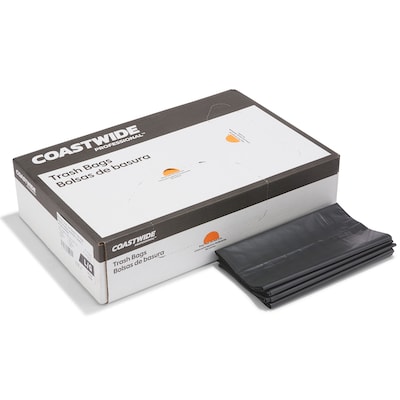 Reduce the risk of tears and leaks while taking out the garbage with these black trash bags. The star-sealed bottom distributes weight evenly to maximize carrying capacity and resists leaks, while the 55- to 60-gallon capacity offers ample room for bulky items. These 1.3-mil-thick Coastwide Professional™ trash bags are made of reprocessed resin to resist puncturing by sharp objects, ensuring clean, reliable waste disposal.