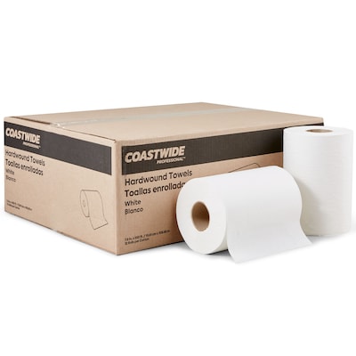 Keep these Coastwide Professional™ hardwound towels in stock for drying hands and wiping up moisture. These one-ply paper towels are strong and durable for wiping up spills or cleaning fluids, but are soft for drying hands on a frequent daily basis. Each roll in this 12-carton features 350 feet of white one-ply paper towels, ideal for use in restrooms or anywhere spills occur. With a 2-inch core and 7.8-inch width, these Coastwide Professional™ white hardwound paper towel rolls are designed to fit most universal towel dispensers.