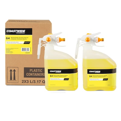 Remove grease and smudges with this multipurpose cleaner. Neutral pH properties allow for use on surfaces not hurt by water. The 3-liter bottle is compact for convenient storage and portability. This cleaner is available in a pre-tipped bottle to ensure you consistently get the right dilution ratio for the best results. This Coastwide Professional™ 64 Multi-Purpose Neutral cleaner features an ergonomic handle for easy dispensing and less mess.