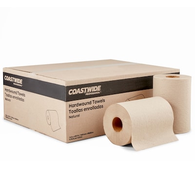 Make an eco-friendly choice with these chlorine-free Coastwide Professional™ hardwound paper towels. These one-ply paper towels are strong and durable for wiping up spills or cleaning fluids, but are soft for drying hands on a frequent daily basis. Each roll in this 12-carton features 350 feet of natural one-ply paper towels, ideal for use in restrooms or anywhere spills occur. An environmentally-friendly choice, these Green Seal-certified towels contain 100 percent recycled fibers. These Coastwide Professional™ natural hardwound paper towel rolls are designed to fit most universal towel dispensers.