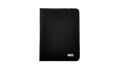 Durable 1000D Cordura nylon folio with Velcro tab, neoprene hand mitt, adjustable stand, stylus holder, and business card slot.