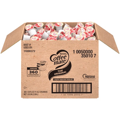 Nestle Coffee mate Original flavored liquid creamer singles are a classic favorite. Within each cup is a deliciously rich, velvety smooth creamer that will enhance and enrich your coffee offer with a touch of differentiation. Packaged in a 360 count box, these are the perfect solution for a delicious and convenient option to customize your favorite beverage. These creamer singles don’t need to be refrigerated and can retain their irresistible flavor at room temperature for up to 9 months. Easy to use - shake, open and pour. Lactose-Free; Cholesterol-Free; Kosher Dairy.