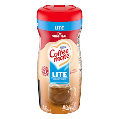 Enjoy creamy coffee with less guilt with this Lite powdered creamer. It contains 50 percent less fat than the original variety for fewer calories, and it's lactose-free, gluten-free and certified kosher to meet restricted dietary requirements. This 11-ounce canister of Coffee-mate powdered creamer has a flip-top lid for easy, controlled pouring.