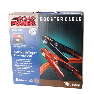 Coleman® Booster cable in red color with polar-glo clamp measures 20' and glows in dark labels. Cable has current rating of 500 A, 4 AWG wire and finds application to transfer power for 6 volt or 12 volt batteries.