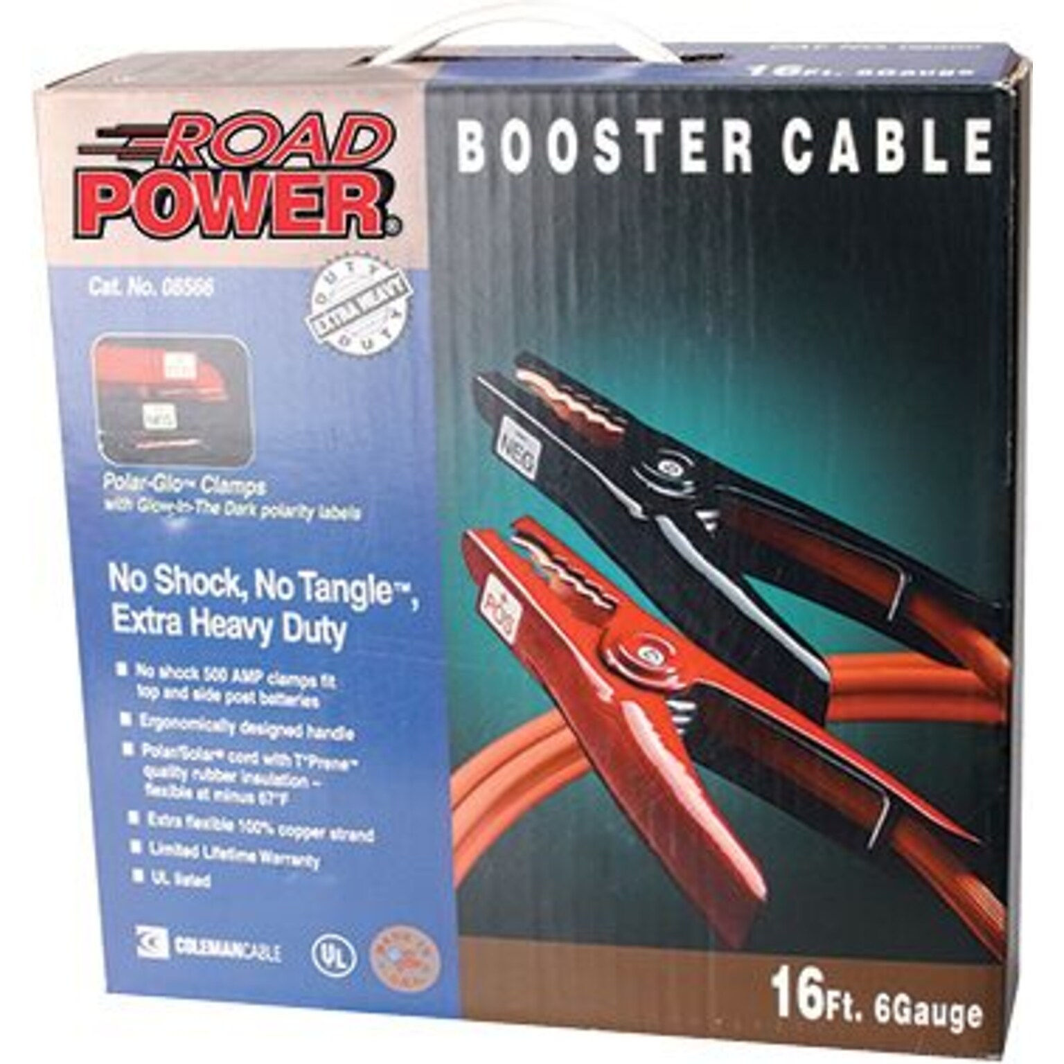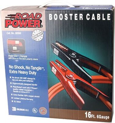 Coleman® Booster cable comes with Polar-Glo clamp has surfaces that are shielded to avoid short circuits and is ergonomically designed. Cable has triple-polarity identification that includes color coding, indent stamping and glow-in-the-dark labels.