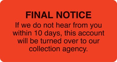 Fluorescent Red "Final Notice - 10 days" label gets results from problem accounts Fluorescent Red "Final Notice - 10 days" label gets results from problem accounts Reduce staff time spent on collection efforts and improve cash flow