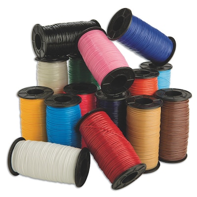 This lacing is perfect for every lacing project. Solid plastic lace will not crack, chip or peel and is more pliable, durable and flame resistant than your average budget lacing. An excellent medium preferred by healthcare facilities, camps, schools and recreation programs. Colors include Orange, Neon Blue, Purple, Glow-in-the-Dark, Pink, Green, Black, Baby Blue, Royal Blue, White, Yellow, Neon Pink, Red, Brown and Natural. You get a total of 15 spools at 100 yards per spool. That's 1,500 yards of lacing! Assortment may vary.
