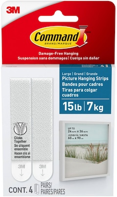- INCLUDES – 4 Pairs of 15 lb. White Bath Picture Hanging Strips (8 strips total); 4 Pairs hold 15 lbs. Maximum frame size of 24 inches x 36 inches