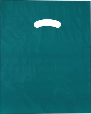 Die-cut handle bags are a 9" wide teal polyethylene bag with a length of 12".