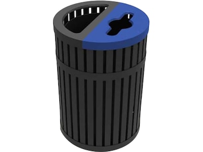 Solve your waste and recycling problems with one sleek and streamlined receptacle. The vibrant black and blue lid with raised lettering clearly identifies each opening to encourage proper disposal. Designed for indoor or outdoor environments with a spacious 45-gallon capacity, this waste receptacle is ideal for high-traffic areas. The weatherproof, powder-coated finish provides a long service life and the lid to base cable and bolt-down hardware protect your investment. This unit also includes two removable liners with built-in handles for easy and hassle-free maintenance.