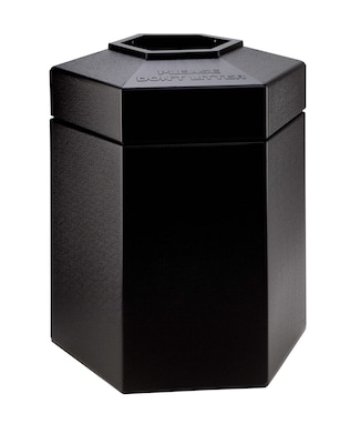 The black, PolyTec Series 45 Gallon Hex Waste Container has a unique, stream lined appearance that offers a larger capacity and convenient ease of use. The patented Grab Bag system secures the trash bag in place for a cleaner appearance with a decreased chance of the lid blowing off. These heavy duty waste containers are designed to withstand the harshest environments as well as offer easy maintenance. Environmentally friendly containers are molded from long-lasting recycled polyethylene. They won't rust, dent or chip.