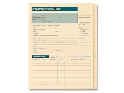 Be sure that employee records are detailed and complete with this confidential personnel folder. The extended tab of this folder allows for quick retrieval and convenient filing, while the light-colored paper ensures writing stands out and is easy to read. This ComplyRight personnel folder is preprinted with space to fill out contact information, employment information and other notes, making it simple to stay organized.