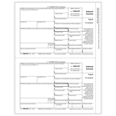 ComplyRight 2025 1099-INT Tax Form, 1-Part, 2-Up, Copy B, 50/Pack (512150)