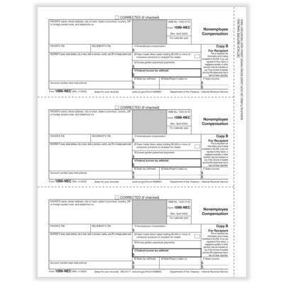 ComplyRight 2025 1099-NEC Tax Form, 1-Part, 3-Up, Recipient Copy B, 50/Pack (NEC511150)