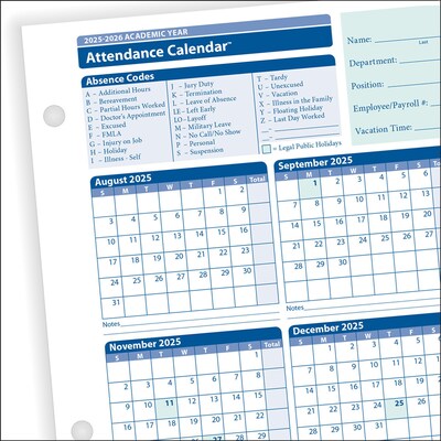 ComplyRight 2025-2026 Academic Year Attendance Calendar Cards, 50/Pack (A43005015)