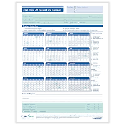 ComplyRight 2026 Time Off Request and Approval Calendar, 50 Forms/Pack (A0037)