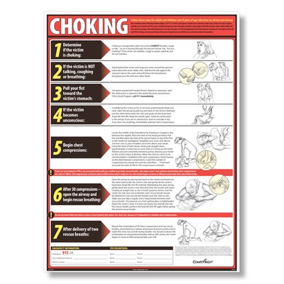Post critical safety information by hanging the most up-to-date Choking Poster in your workplace. This eye-catching poster provides your employees immediate access to the most current choking techniques. Clearly illustrated, it can shave seconds off a life-sustaining procedure in the event of a choking incident.