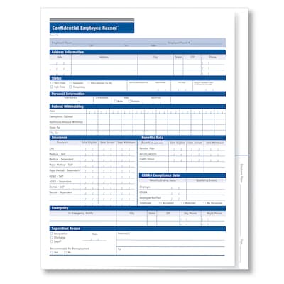 The ComplyRight confidential employee records folder complies with state and federal recordkeeping laws and makes it easy to record, store and file important employee data.