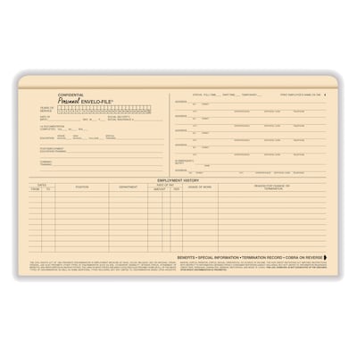 Even in today's digital work environment, maintaining original employee records is necessary. The legal-size ComplyRight Confidential Personnel Envelo-File is ideal for safely storing employment applications, evaluation forms, warning notices and other employee paperwork. The smart design also allows you to record key information and benefits right on the folder, putting everything at your fingertips for greater convenience.