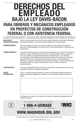 ComplyRight™ Davis bacon act poster in Spanish language contains specifics about minimum wage/overtime/the use of apprentices/more. Poster tells about specialized labor law depending on the specifics of operations/the nature of relationship.
