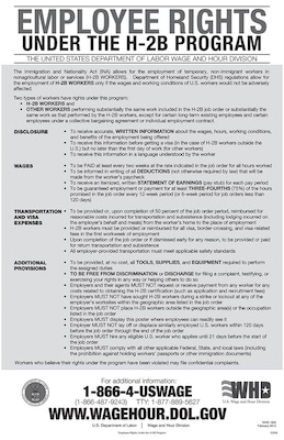 - Poster outlines H-2B workers' rights regarding disclosure, wages, transportation, and other provisions and this poster is required under the H-2B program