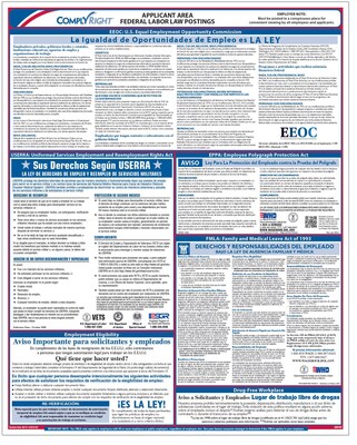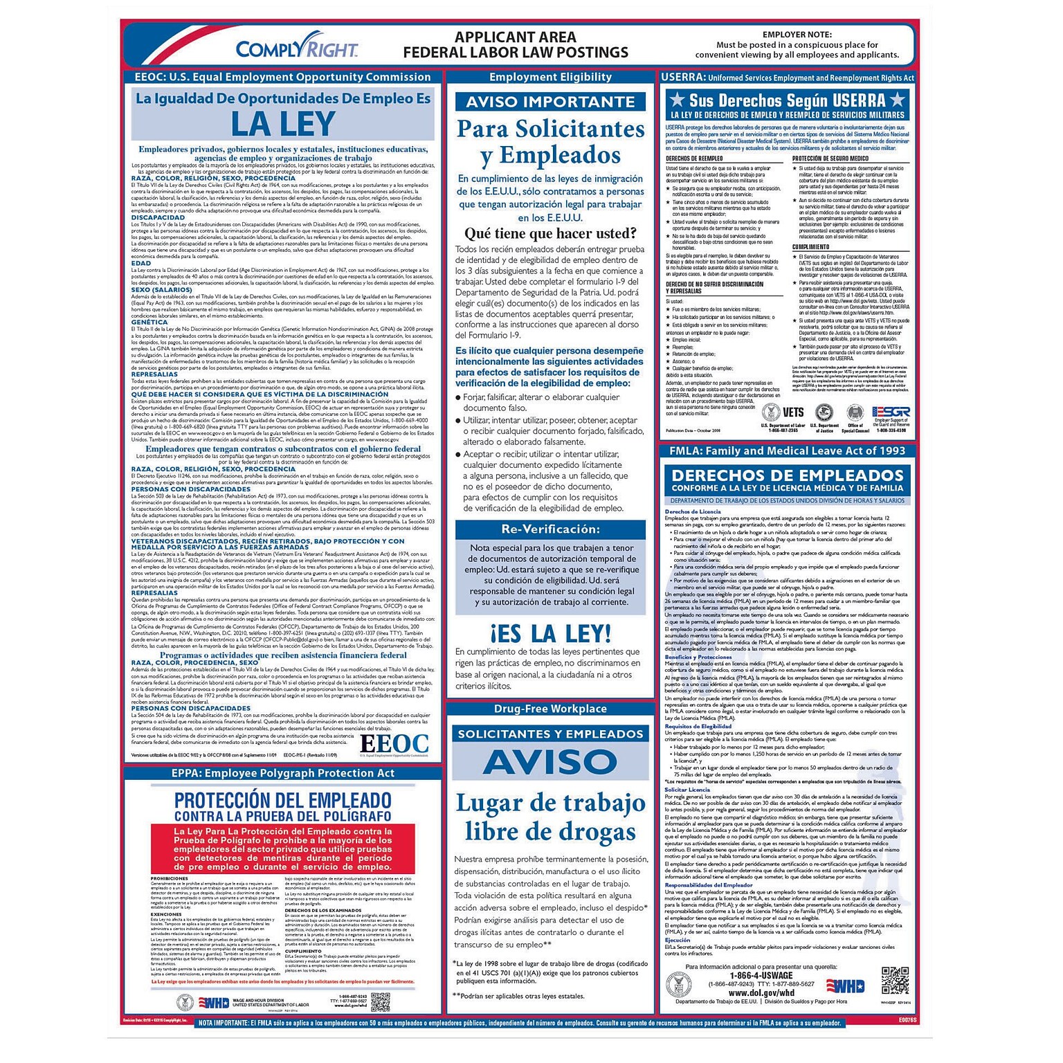 The ComplyRight Federal Applicant Area Poster fulfills mandatory federal posting requirements for applicant areas. It includes all required federal postings, as well as non-mandatory I-9 and Drug-Free Workplace notices to inform applicants of U.S. employers employment eligibility and your drug- free workplace policy. The poster is laminated for durability and meets strict government requirements for color, font and size. It is available in English, Spanish and bilingual.