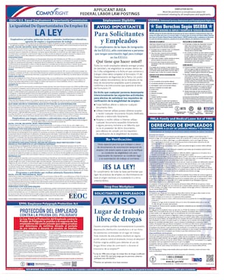 The ComplyRight Federal Applicant Area Poster fulfills mandatory federal posting requirements for applicant areas. It includes all required federal postings, as well as non-mandatory I-9 and Drug-Free Workplace notices to inform applicants of U.S. employers employment eligibility and your drug- free workplace policy. The poster is laminated for durability and meets strict government requirements for color, font and size. It is available in English, Spanish and bilingual.