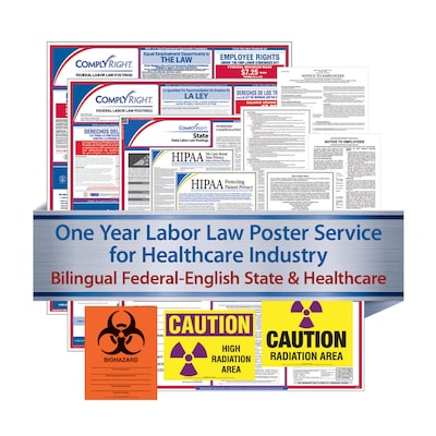 Developed to meet the additional federal and state posting needs of healthcare facilities, ComplyRight Poster Service for Healthcare offers a complete laminated federal and state poster set, along with industry-specific posters, to help healthcare employers comply with these requirements and ensure that employees are informed of their rights. This service includes one year of legal monitoring and automatic updates at no additional cost for 365 days of worry-free compliance. All posters meet strict government requirements for color, font and size. The topics covered in the posters include: Fair Labor Standards Act, Family and Medical Leave, Employee Disabilities Rights, Minimum Wage, Equal Employment Opportunity, Child Labor Law, Veteran Rights, Rad Radiation, Job Safety and HIPAA.