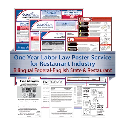 Developed to meet the additional federal and state posting needs of food service facilities, ComplyRight Poster Service for Restaurants offers a complete laminated federal and state poster set along with industry-specific posters, to help food service e employers comply with these requirements and ensure that employees are informed of their rights. This convenient service includes free, automatic poster replacements for mandatory posting changes and posters for newly added posting requirements, along with one year of legal monitoring for 365 days of worry-free compliance. All posters meet strict government requirements for color, font and size.